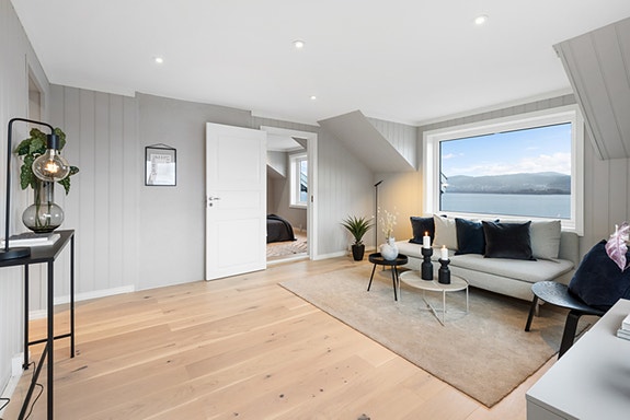 Svelvikveien 98 er en luftig og tiltalende 2-roms eiet loftsleilighet, i 2. etasje av en horisontaldelt tomannsbolig. Eiendommen ligger like ved Drammensfjorden og en rekke fine badeplasser. I tillegg er det busstopp rett utenfor og kort vei til butikker. Utsikt til fjorden kan nytes fra de fleste rom, men også en stor veranda fra 2022. Parkering gjøres på en felles gårdsplass rett nedenfor.