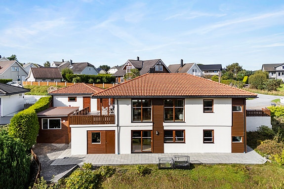 - Solrik opparbeidet eiendom som byr på stor veranda, plan innehekket hage, hellelagte passasjer, asfaltert oppstillingsplass og koselig utestue.