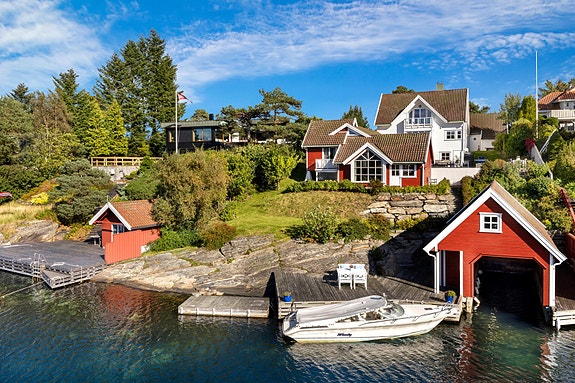 Eiendommen har en særdeles flott beliggenhet med sol fra morgen til sene kvelden. Stor usjenert tomt med stort oppvarmet svømmebasseng, strandlinje, dypvanns bryggeanlegg med plass for flere båter og flotte bademuligheter fra både brygge og eget svaberg, båthus med oppheng for stor båt (ca. 30 fot) og stor hems med muligheter. Eksklusiv vestvendt eiendom med tomt ned mot sjøen. Huset ligger i lite trafikkert gate uten gjennomgangstrafikk.