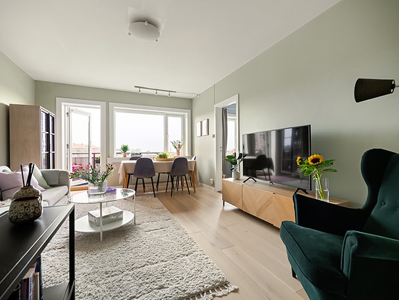 Dette er en gjennomgående og pen 2-roms, fint beliggende i byggets 3. etg. Leiligheten har i dag en meget praktisk planløsning, med separat kjøkken, stor stue og et romslig soverom. På soverommet er det rikelig med plass til stor dobbeltseng, oppbevaring og hjemmekontor. Fra stuen finner vi leilighetens balkong, som byr på en enestående utsikt over hustakene og fjorden. Denne er vendt mot syd, noe som er synonymt med sol og dagslys - uansett årstid!