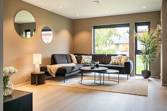 Stue og kjøkken er på til sammen 35,4 kvm og har en åpen løsning. Kjøkkenet leveres fra HTH og har integrerte hvitevarer fra Electrolux. Man har direkte utgang til en flott markterrasse med 28x120 Royal-impregnerte terrassebord i farge RG25 grå. Stue og kjøkken har store vindusflater som gir rikelig med lysinnslipp. Rommet har ellers svært godt lys via downlights i tak. Alle vinduene i huset forøvrig har solskjerming.