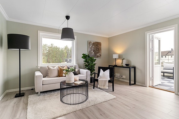 Lys og pen 3-roms leilighet i 2. etg. som inneholder gang, bad, stue, kjøkken og 2 soverom. I tillegg har leiligheten veranda på ca 15 kvm, lagerplass på loftet, 2 boder i kjeller og tilgang til felles vaskekjeller med plass for egen vaskemaskin.