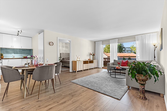 Aleona Snekkestad ved Eiendomsmegler 1 avdeling Tonsen ønsker deg velkommen til Lofrudshøgda 209. Leiligheten har en åpen og sosial planløsning mellom stue og kjøkken.