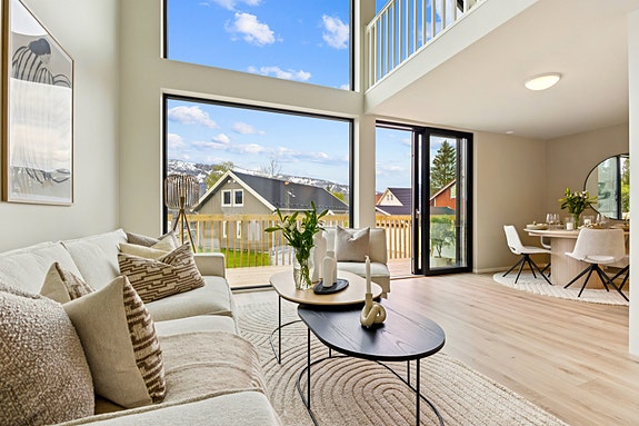 Innholdsrik planløsning: - Første etasje byr på entré/gang, et moderne kjøkken, lys og trivelig stue med utgang til terrasse og formidabel takhøyde. Videre får du et stort bad/vaskerom, soverom og en bod/teknisk rom. Loftsetasjen byr på 2 gode soverom, loftstue og et eget toalettrom.