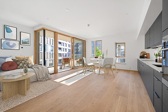 Denne helt nye og ubebodde 3-romsen i 4. etasje byr på moderne komfort, eksklusivt preg og en beliggenhet som kombinerer storbyens puls med fjordbyens ro. Leiligheten har en gjennomført planløsning med lys stue og kjøkken i åpen løsning, store vindusflater og utgang til en privat hjørnebalkong på 13 kvm med gode solforhold. Kjøkkenet fra Sigdal leveres med integrerte hvitevarer i høy kvalitet, og leiligheten har en innvendig bod og disponerer en bod i kjeller på 6 kvm.