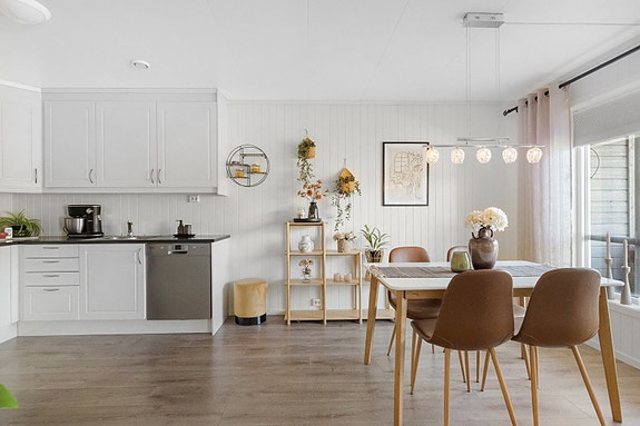 - Åpen og romslig stue-/kjøkkenløsning med store vinduer og utgang til terrasse
