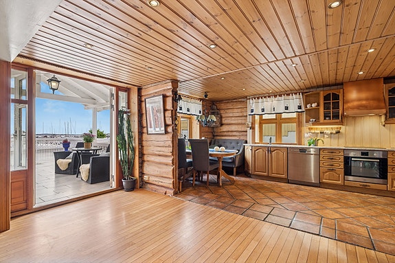 Bygningen er antatt oppført i ca. 1740 og gjennomgikk ombygning i 2001 hvor blant annet de opprinnelige detaljene som eksponert tømmer ble bevart. Leiligheten ligger i 1. etasje med trapperfri adkomst og inneholder kjøkken og stue med åpen løsning, 2 soverom, bad/vaskerom, gang og bod. Det er stor og herlig terrasse på hele 68m² m/fantastisk utsikt! Dobbelgarasje med boder medfølger, som er helt unikt for en leilighet beliggende i hjertet av Holmestrand sentrum.