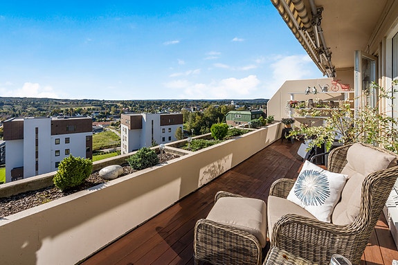 Lys og innbydende leilighet med vestvendt balkong, flott utsikt, heis og attraktiv beliggenhet nær sentrum. IN-ordning.