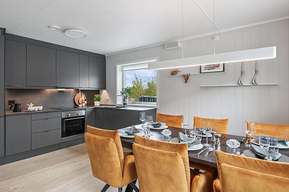 Boligen går over to plan og har en god og familievennlig planløsning med fire soverom, to delikate bad, vaskerom og 2 stuer. Den gjennomgående moderne standarden inkluderer balansert ventilasjon og elektrisk gulvvarme i flere gulv. Fra stuen er det utgang til en stor terrasse og hage. En praktisk utvendig, isolert bod på 5 m² gir ekstra lagringsplass.