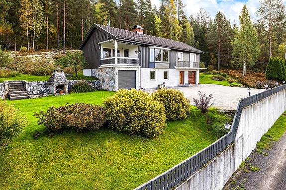 Idyllisk beliggende enebolig med skogen som nærmeste nabo. Stor garasje og solrik tomt. God planløsning med potensial!