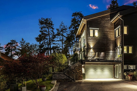 Moderne enebolig m/heis, hybel og høy standard. Integrert garasje m/lader. Solrike uteplasser og fantastisk fjordutsikt