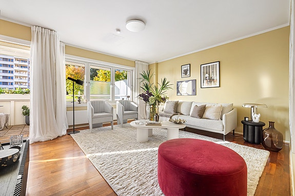 Flott 3-roms i frodige omgivelser I Solrik balkong I Oppvarming/vv. inkl. I Familievennlig nablag I Heis i bygget
