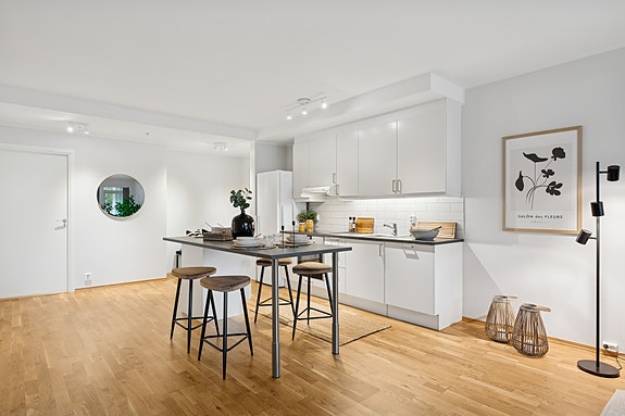 Leiligheten ligger i 2. etasje og har en åpen og romslig stue-/kjøkkenløsning med store vindusflater som slipper inn rikelig med dagslys. Kjøkkenet er fra Sigdal og holder en moderne stil med integrerte hvitevarer og kjøkkenøy som gir ekstra arbeids- og oppholdsplass. Fra stuen er det utgang til innglasset balkong - en lun uteplass som kan brukes store deler av året.