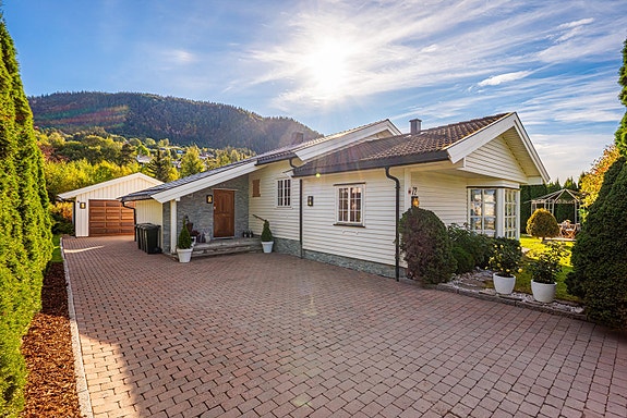 Steinlagt gårdplass og overbygd uteplass. Pent opparbeidet hage.