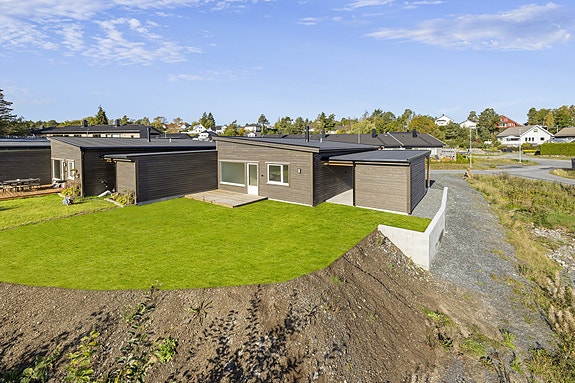 Helt ny og moderne enebolig i rekke med alt på en flate - Carport, elbillader, hage og sportsbod - Sentralt på Rykene