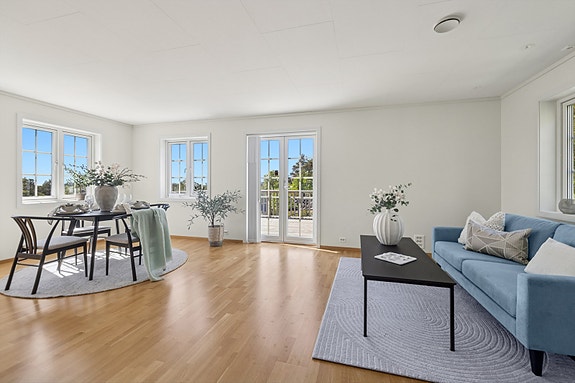 Spisestue og stue sett i sammenheng. Terrassedør, vinduer og gjennomgående planløsning skaper en lys og innbydende atmosfære.