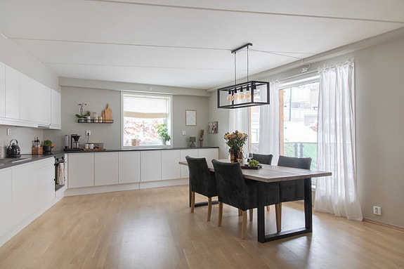 Leil. byr på en stor og åpen stue-/kjøkkenløsning med store vindusflater. Kjøkkeninnredningen er lys, har integrerte hvitevarer og rikelig med skap- og benkeplass. Det er tre gode soverom, hvorav hovedsoverommet har tilknyttet eget bad og garderoberom. De to andre sov. er lyse og trivelige og er perfekt som barnerom/gjesterom eller kontor. Videre er det to delikate flislagte bad. Det er vannbåren gulvvarme i leil.
