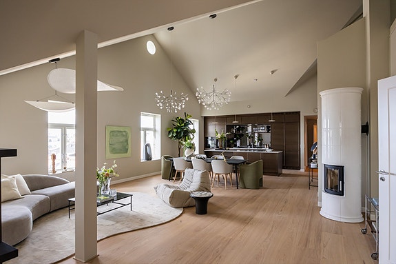 Ny, eksklusiv toppleilighet med attraktiv beliggenhet i rolig gate | Svært god standard | Ildsted | Takhøyde på 5,41m.