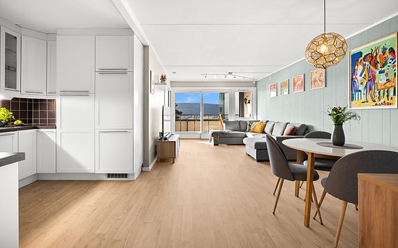 Leiligheten fremstår lys og fin med store vindusflater og stor innglasset balkong. Boligen har en god standard og har et morderne preg. Fyring og varmtvann er inkludert i fellesutgiftene.