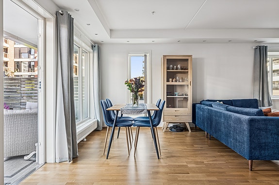 • Lys hjørnestue med store vindusflater og utgang til flott nordvestvendt markterrasse på 15 kvm