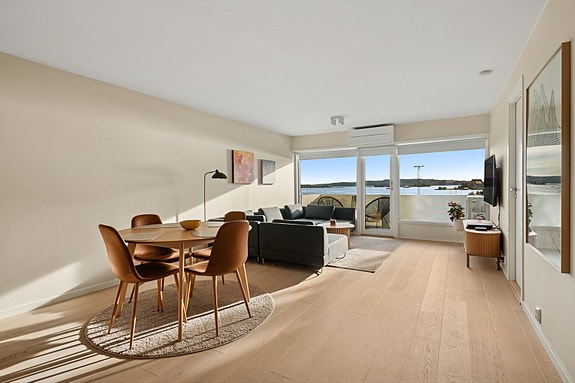 Delikat oppusset leilighet m/delvis åpen stue-og kjøkkenløsning. 2 soverom, vestvendt balkong m/utsikt over Oslofjorden!