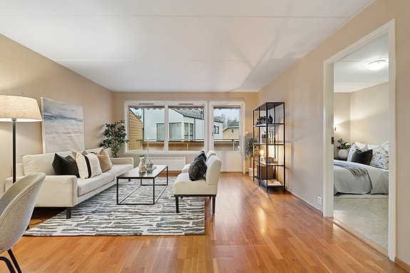 En lys og velholdt 3-roms eierleilighet med fin beliggenhet i øverste etasje. Leiligheten har en stor og solrik balkong m/ markise på ca. 19 m² som er vender ut mot rolige omgivelser. Leiligheten er gjennomgående og inneholder gang med garderobe, to soverom, flislagt bad, kjøkken med spiseplass, romslig stue og innvendig bod. Leiligheten disponerer også én p-plass og én bod i garasjekjeller.