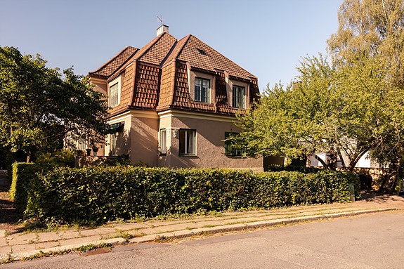 Klassisk og herskapelig familiebolig med vakker hage, garasje og særpreget arkitektur.