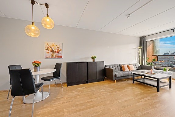 Leiligheten ligger luftig til i 5. etasje og har en overbygget, innglasset balkong som fungerer som en forlengelse av stuen - ideell både sommer og vinter. Bygget er fra 2020 og holder en moderne og gjennomført standard, med vannbåren gulvvarme, god planløsning og fine lysforhold.