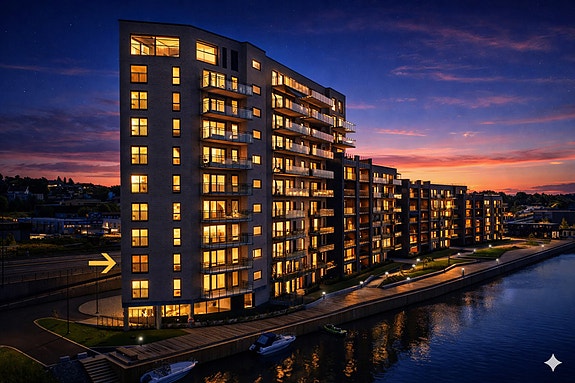 Mosseveien 71 - et moderne bygg ved elvebredden, få minutter fra sentrum. Den attraktive beliggenheten byr på bryggepromenade, mulighet for båtplasser og rask tilgang til sentrum langs flotte sykkelveier. Det er busstopp rett utenfor døren hvor bussen tar deg rundt i byen, eller direkte til flyplassen!