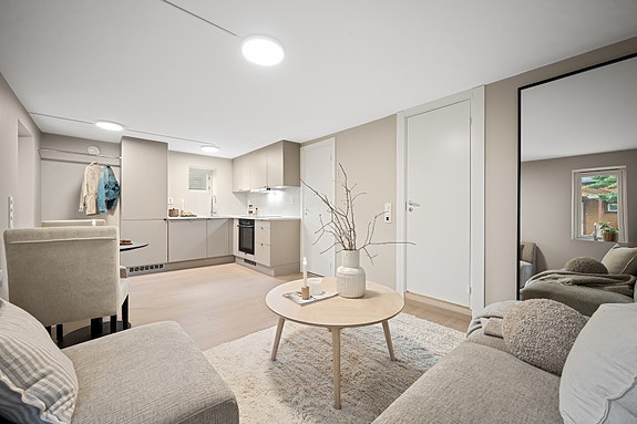 Leiligheten ligger i underetasjen og inneholder stue/kjøkken, soverom, bad/vaskerom og bod.