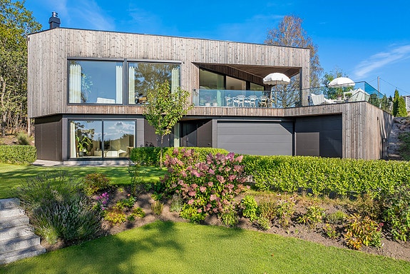 Boligen ligger landlig til i naturskjønne omgivelser, med et design som smidig glir inn i terrenget. Du kjører allee forbi pent opparbeidet hage og opp til garasje og inngangsparti - en innbydende start på hjemmet ditt.