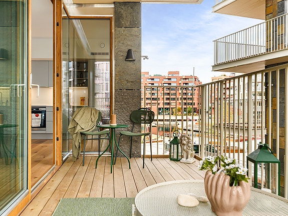 Leiligheten har en lys og åpen stue- og kjøkkenløsning med store vinduer og utgang til en balkong med hyggelig utsyn mot kanalområdet.