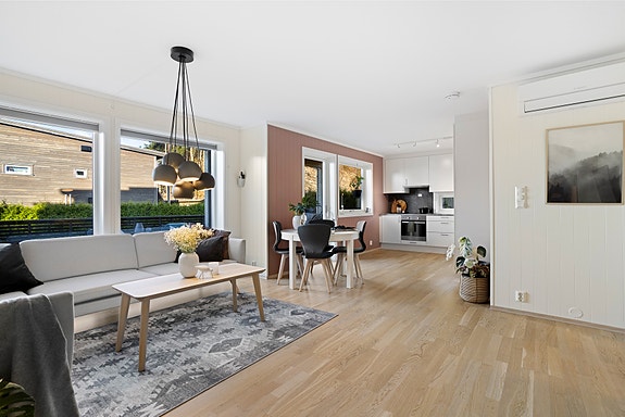 Stuen ligger i en fin, åpen løsning mot kjøkkenet og har utgang til terrasse.