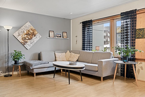 Denne lyse og innbydende leiligheten ligger i 1. etasje og har store vindusflater som slipper inn rikelig med dagslys og skaper en åpen og luftig følelse. Stuen er romslig med god plass til sittegruppe, og har direkte utgang til en koselig balkong. Leiligheten har flere boder og rikelig med lagringsplass, praktisk for en ryddig og funksjonell hverdag.