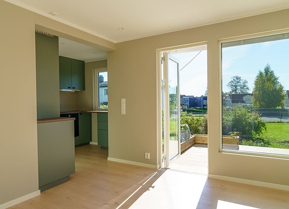 Leiligheten ligger i 1 etasje med tilgang til en 24 kvm. ny sørvendt terrasse rett ut fra stuen.