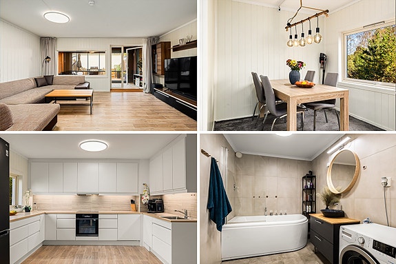Velkommen til en pen leilighet som er betydelig påkostet / pusset opp den senere år. Nytt Sigdal kjøkken i 2022, pusset opp baderom i 2021( av fagfolk), samt mesteparten i underetasjen i samme år + varmekabler. Elanlegg er vesentlig oppgardert i 2021 og ny 15 m² impregnert terrasse fra 2023, med levegger i tre. Moderne og jevnlig vedlikeholdt leilighet med gode lagringsmuligheter i både stor garderobe og bod i underetasjen, samt 2 boder (1 bod i felles gang og 1 utebod i rekke). Super planløsning og rikelig med oppbevaringsplass til sportsutstyr, sesongvarer og hagemøbler. Veletablert og barnevennlig område med kort gangavstand til barnehager, barne og ungdomsskole, kyststi, badeplass, flotte turområder og sentrum med alle byens fasiliteter. Buss-stoppested med hyppige avganger rett ved.