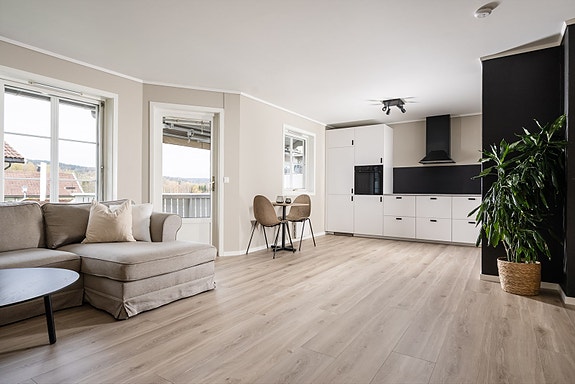 Leiligheten ligger i 2. etasje og har en gjennomgående god standard med nye gulv, nymalte overflater og helt nytt kjøkken fra 2025 med integrerte hvitevarer. Den åpne løsningen mellom stue og kjøkken gir et luftig og sosialt oppholdsrom, og fra stuen har du utgang til en solrik balkong. Leiligheten har to romslige soverom, bad med ny vask og servantskap, en praktisk bod med hyller samt loft med god plass til lagring. Egen garasjeplass i felles rekke følger med.