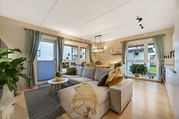 Leiligheten ligger i 1. etasje med trappeløs adkomst, og inneholder entré, stue/spisestue med åpen kjøkkenløsning. Utgang til overbygget romslig (17 kvm) balkong med screens og markise, med egen trapp til felles hage. 3 soverom, hvorav hovedsoverom med skyvedørsgarderobe og walk-in garderoberom/teknisk rom. Screens på de to andre soverommene, som også har skyvedørsgarderober.
