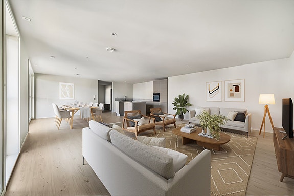 Leiligheten holder en gjennomgående god standard. Inneholder stue med åpen kjøkkenløsning med innredning fra Aubo med alle hvitevarer integrert, 2 soverom og bad med vaskeromsopplegg.