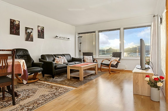 Tilbaketrukket 3-roms andelsleilighet | Parkering og bod | Utsikt over fjorden | Overbygd veranda | Ingen dok.avgift