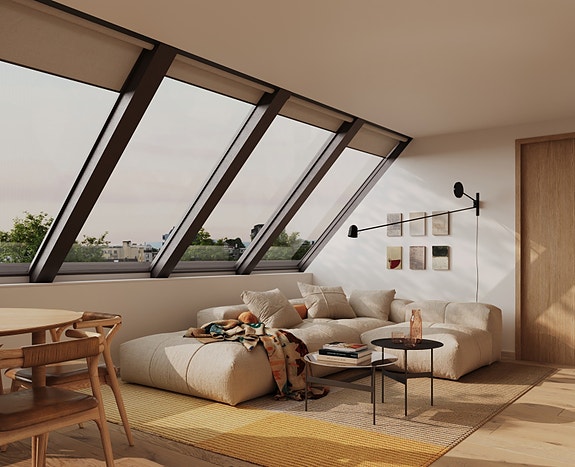 - Store takvinduer som skaper en lys og luftig atmosfære