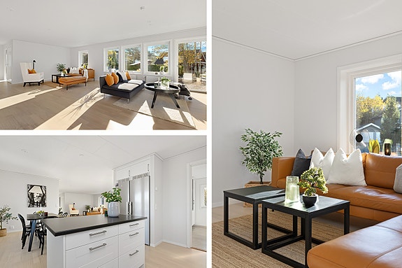 Linnéa er et stort og luftig enetasjes hus med 3 soverom. Her er soverommene strategisk plassert i den ene enden av huset, som de to badene. Se det som én sosial og én privat flate, en for voksne og en for barn.