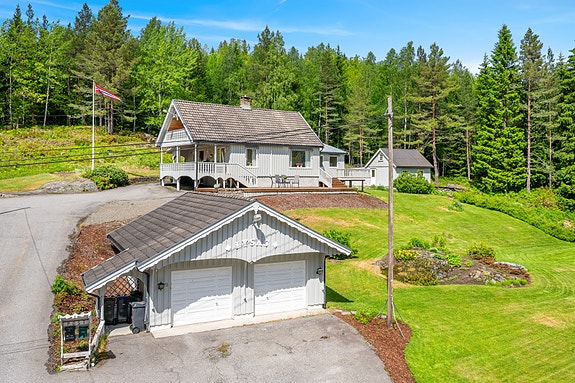 Tomten er godt opparbeidet med plen, terrasse, hage og asfaltert oppkjørsel med plass til flere biler. Det er også overbygget inngangsparti og terrasser