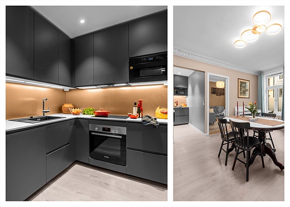 Leiligheten ligger i en klassisk bygård fra 1903 med en flott felles bakgård. Dette er en romslig 4-roms oppusset i 2021, med mulighet for hybeldel med egen inngang. Tidligere har hybeldelen hatt kjøkken, som nå er fjernet, men bevart røropplegg for tilbakestilling. Boligen kombinerer klassisk sjarm med moderne standard, gjennomgående høy takhøyde, stukkatur og rosett som skaper en elegant atmosfære. Beliggenheten er rolig og attraktiv, i en enveiskjørt gate på St. Hanshaugen, med kort vei til park, kaféer og hyggelige turområder.