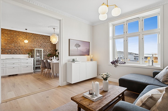 Leiligheten ble oppusset i 2024 og fremstår som gjennomført stilren med nøye utvalgte materialer og tidsriktige løsninger. Her får du de klassiske detaljene mange drømmer om - vakker stukkatur, rosett i taket, god takhøyde og store vindusflater som slipper inn rikelig med dagslys. Samtidig byr kjøkken og bad på moderne standard og funksjonelle løsninger for en behagelig hverdag.