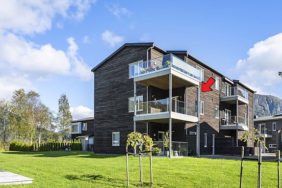 Leiligheten ligger i 2. etasje og inneholder entre, to bad, to soverom, vaskerom, stue og kjøkken i åpen løsning. Fra stuen er det utgang til overbygget balkong på 13 kvm. Fra eiendommen er det omtrent 1 km til Førde sentrum, med behagelig gang- og sykkelavstand til skole, barnehage, høyskole og sykehus.
