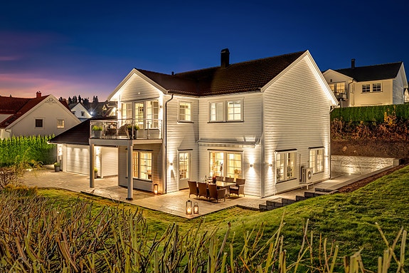 Tiltalende familiebolig med fire soverom, to bad, markterrasse, balkong og sjøutsikt. Garasje med el-billader.