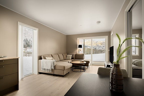 Hytta er plassert lengst frem mot sjøen i Bjørndalen og nyter fantastisk utsikt og gode solforhold som oppleves gjennom vindusflater og store verandaarealer.