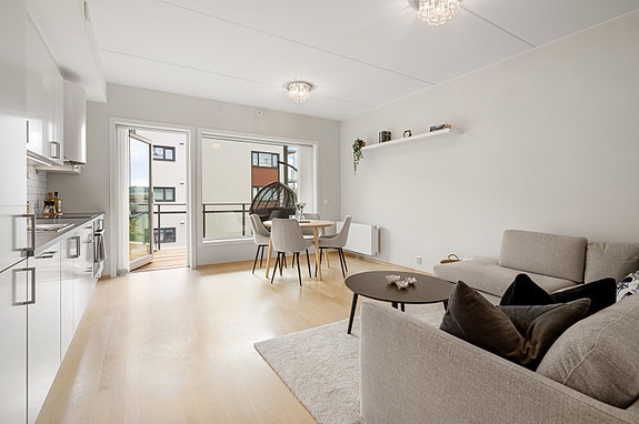 Her bor du skjermet til i et rolig tun med kort vei til lekeplass og felles grøntarealer, samtidig som du har gangavstand til skole, barnehage og gode kollektivforbindelser. Boligen inneholder blant annet to bad og fire soverom, hvorav det ene i dag benyttes som TV-stue. Her får du flere herlige uteplasser - en romslig terrasse i første etasje, en balkong i andre etasje og en solrik takterrasse med sørvestvendt beliggenhet.
