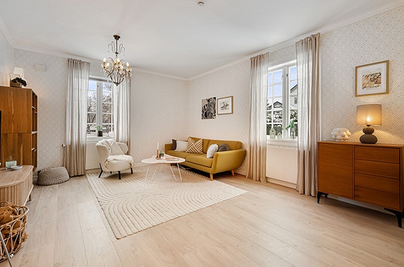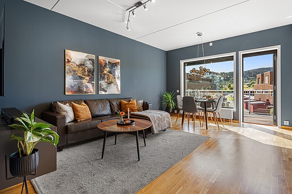- God takhøyde og store vindusflater gir boligen en lett og luftig atmosfære